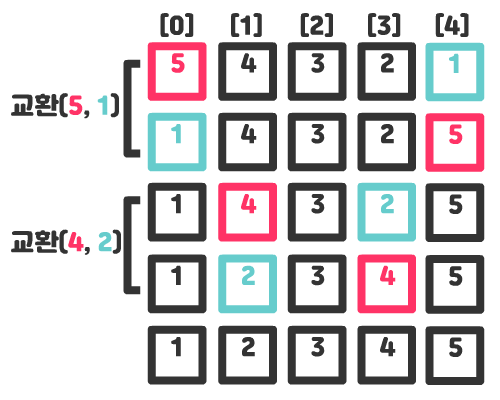 두 값을 교환하기 때문에 배열 길이의 절반의 순환문만 돌면 된다.