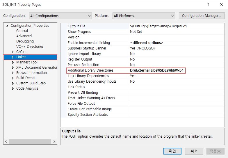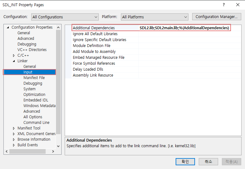 SDL2는 기본적으로 SDL2.lib와 SDL2 main.lib 두 개의 추가 종속성을 가진다.