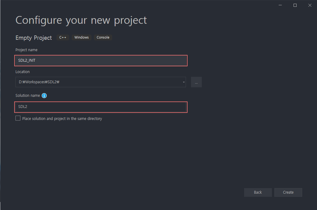 SDL2 프로젝트를 관리할 비주얼 스튜디오 설루션을 생성한다.