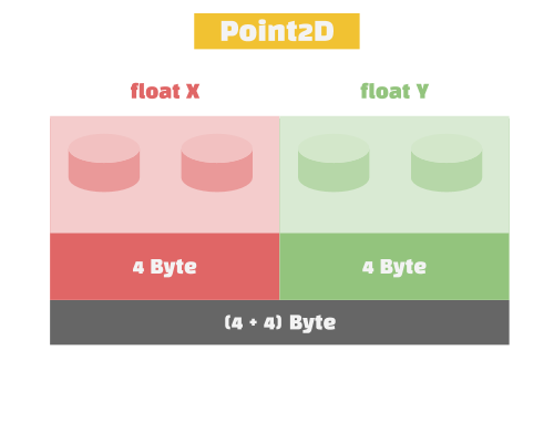 float(4 Byte) 두 개를 가지는 (4 + 4)Byte의 크기를 가지는 Point2D는 새로운 자료형이 만들어졌다.