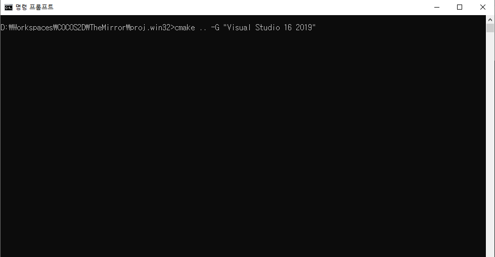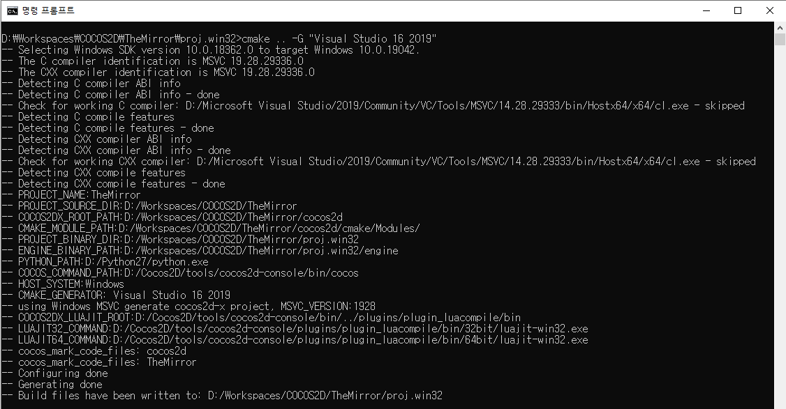 proj.win32경로에서 아래의 명령어를 입력하면 자동으로 비주얼 스튜디오 개발 환경을 생성해준다.