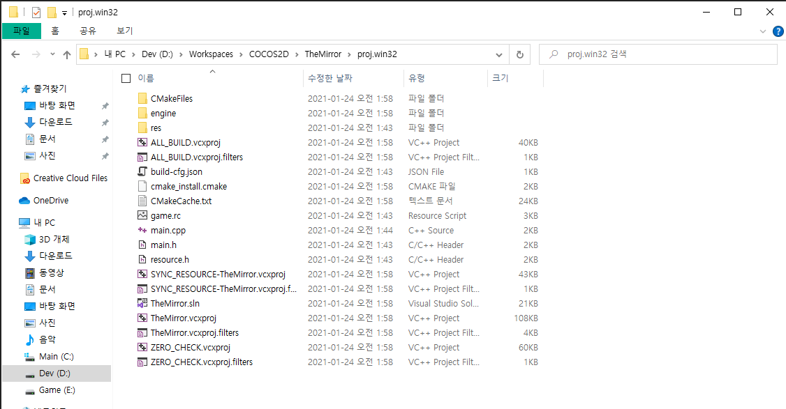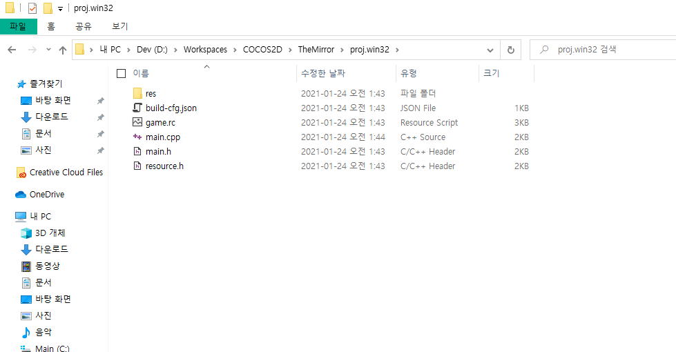 ▼ TheMirror/proj.win32 폴더에는 Main.cpp 파일만 덩그러니 있다.