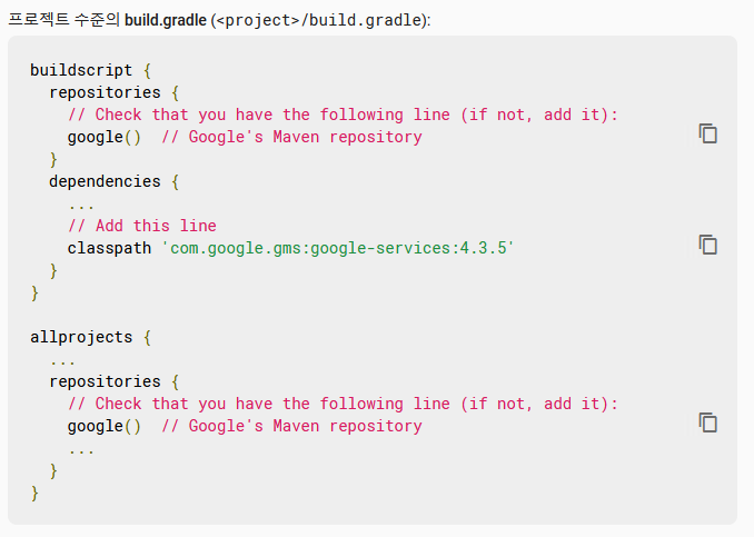 (각 종속 항목들 버전 확인 -> https://firebase.google.com/docs/android/setup?hl=ko#available_libraries) ▶ project Gradle buildscript { repositories { .... } dependencies { classpath 'com.android.t..