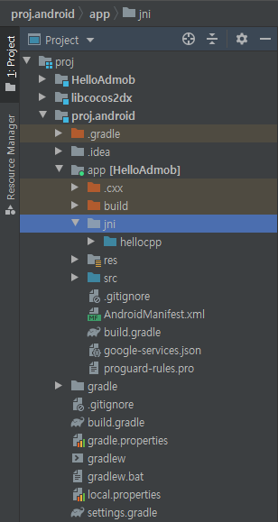마찬가지로 build.gradle (Module: proj.android.HelloAdmob)을 더블 클릭하면 수정할 수 있다.