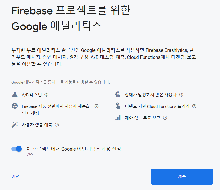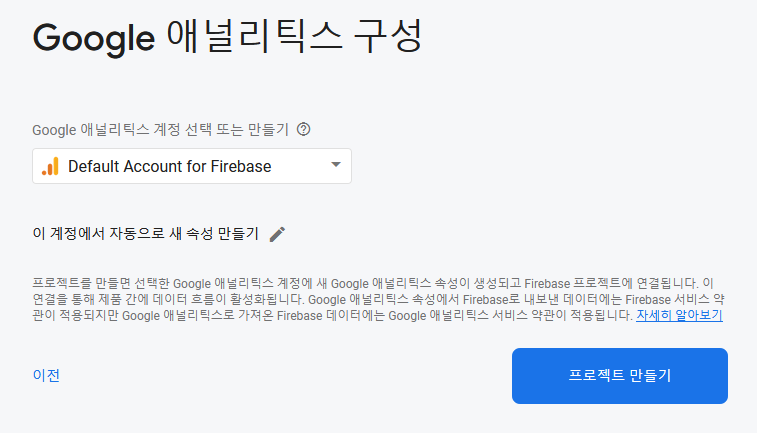 그다음엔 Google 애널리틱스 계정을 선택하라고 뜨는데 그냥 Default Account for Firebase를 사용하면 된다.