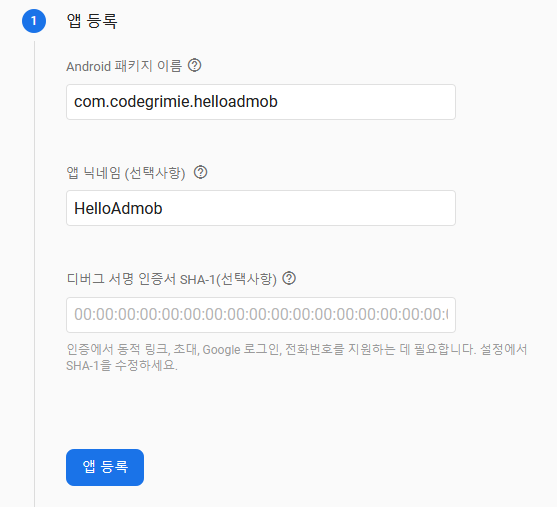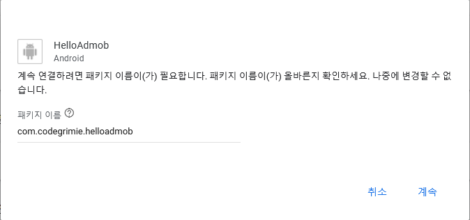 앱 등록을 위한 패키지 이름은 아까 Cocos2D-X 프로젝트 만들 때 사용한 걸 그대로 입력하면 된다.