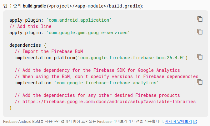 앱을 등록하고 나면 이제 실제 앱에다가 Firebase를 사용한다고 연동해줘야 한다.